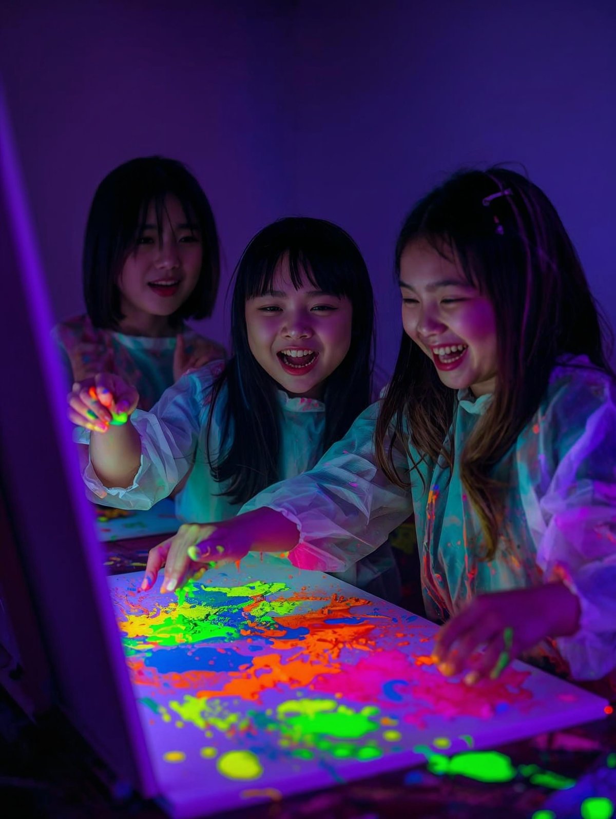Les enfants créent des œuvres vibrantes et lumineuses avec des peintures fluorescentes qui s’illuminent dans l’obscurité. Laissez parler leur imagination !